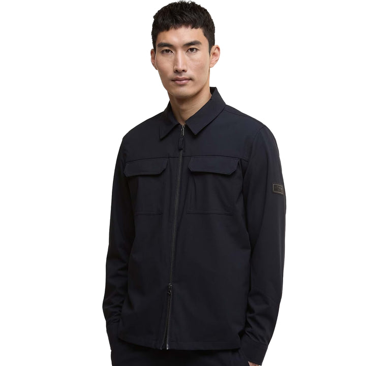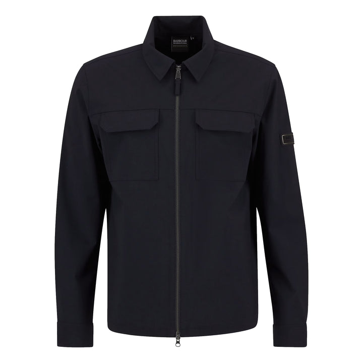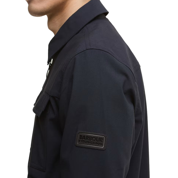 The Barbour International Ash Overshirt in Navy features a regular fit and a poly-blend fabric with stretch for comfort. It includes a full zip closure, two chest pockets, and classic shirt-style cuffs. Finished with the iconic Barbour International logo badge on the sleeve, this overshirt combines style and functionality effortlessly.