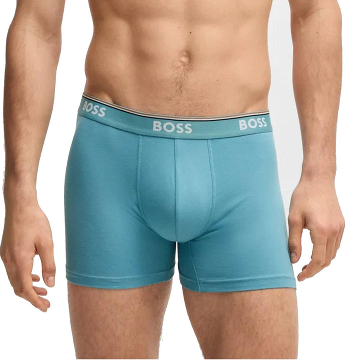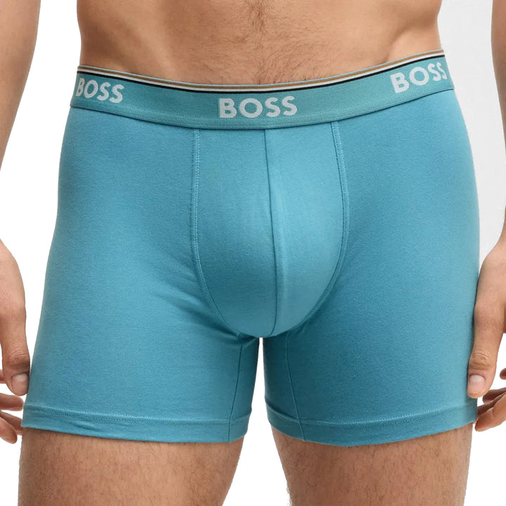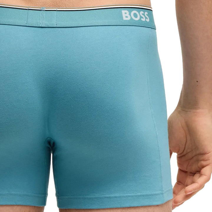 The BOSS Cotton Stretch 3 Pack Boxer Briefs in Black, Blue, and Dark Grey feature soft, stretchable cotton for exceptional comfort and a tailored fit. Designed with a regular-rise waist, these briefs include the signature BOSS elastic waistband and a contoured pouch, combining functionality with refined style for your daily wardrobe.