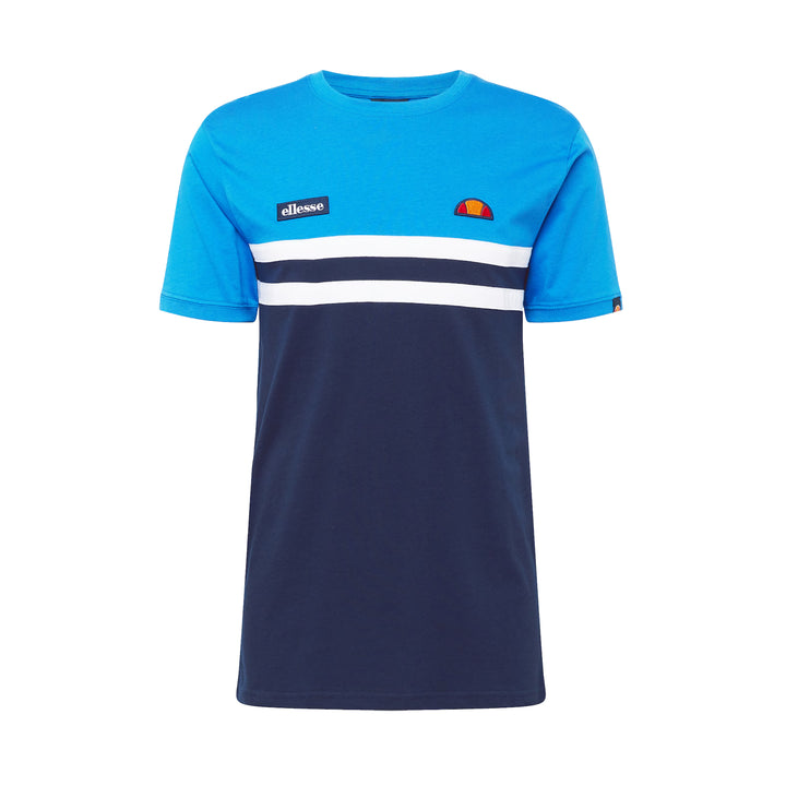 Experience the Ellesse Venire T-Shirt in Blue/Navy, designed with a comfortable regular fit and crafted from soft cotton for all-day wear. Its crew neck and short sleeves complement striking contrast colour block accents and a bold double stripe across the chest. Finished with elegant embroidered Ellesse branding, this tee effortlessly combines style and comfort to elevate your wardrobe.