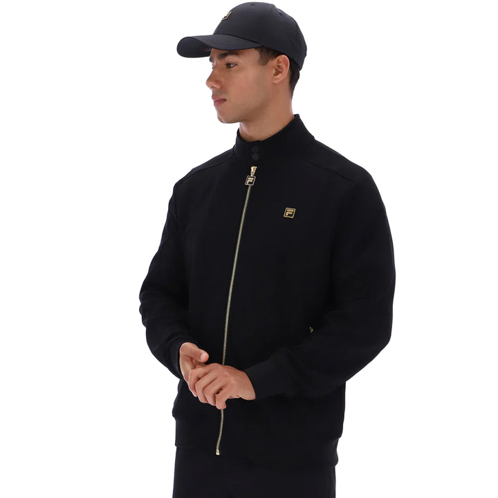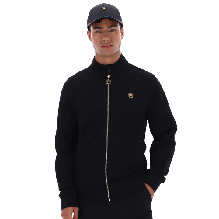 The Fila Davey Biker Neck Full Zip Track Top in Black features a regular fit and a distinctive biker neck design. Part of the exclusive Gold Collection, this jacket includes a full zip closure, convenient side pockets, and ribbed trims. It is finished with a Fila gold logo badge for a premium touch.