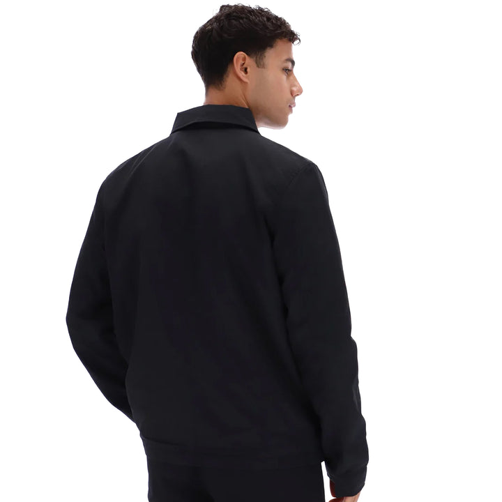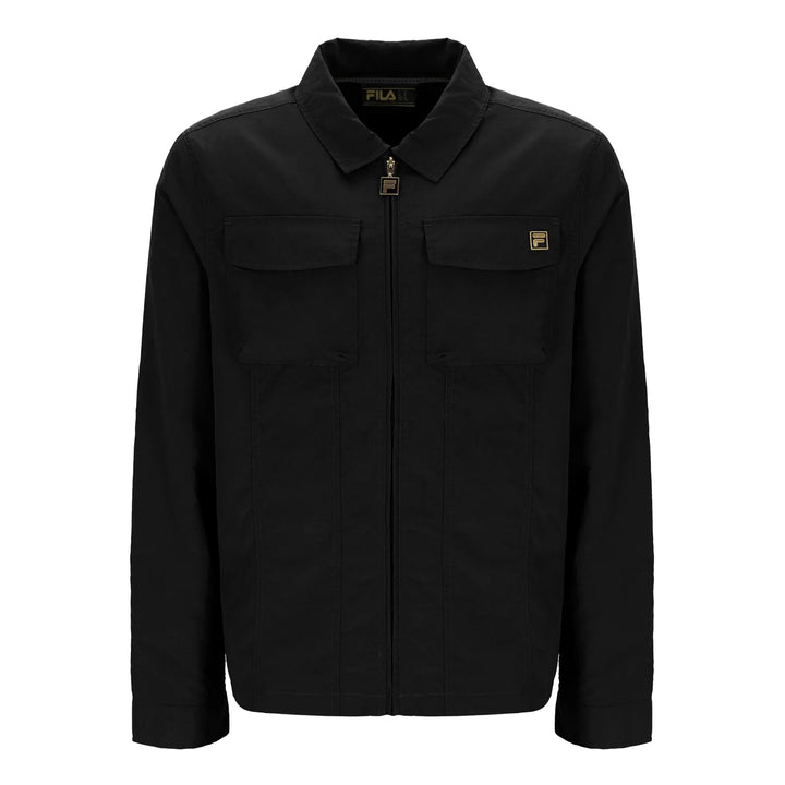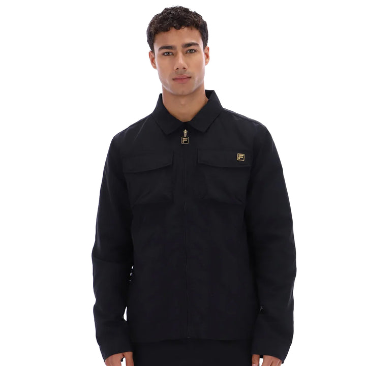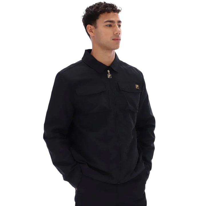 The Fila Kasa Full Zip Overshirt in Black features a regular fit with a fold-down collar and a full zip front. It includes chest pockets for added functionality and is part of the premium GOLD collection, showcasing a black and gold logo badge.