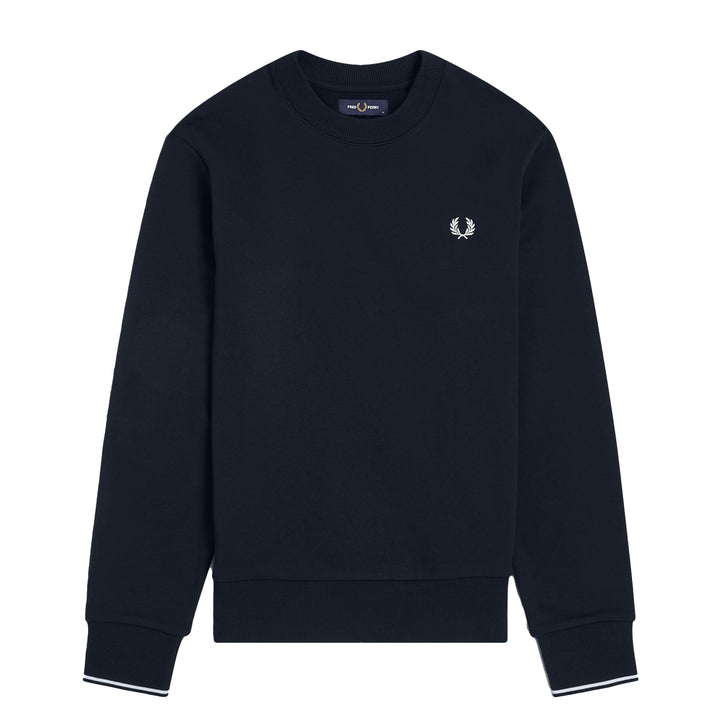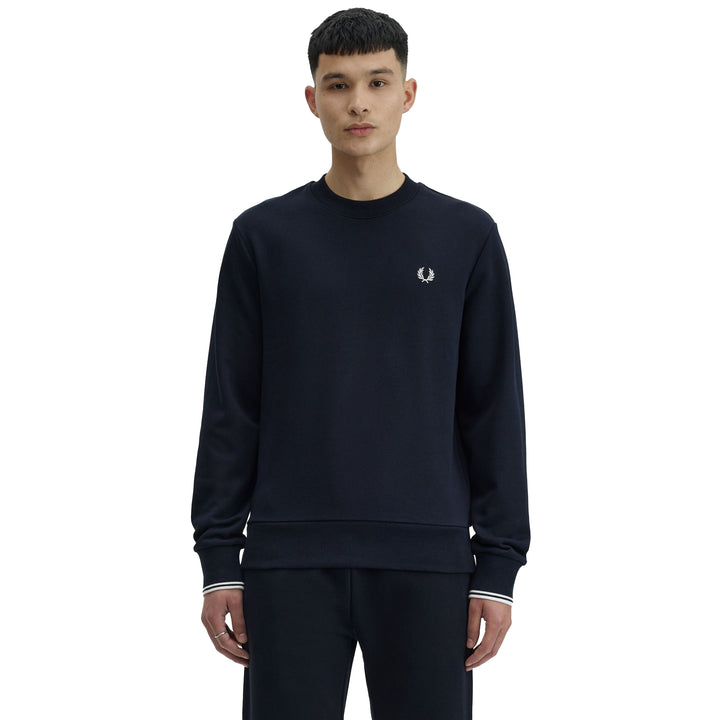 This Fred Perry sweatshirt in navy features a regular fit crafted from pure cotton sweat fabric. It includes a ribbed crew neck, cuffs, and hem, complemented by twin-tipped cuffs and the iconic Laurel Wreath logo embroidered in colour contrast.