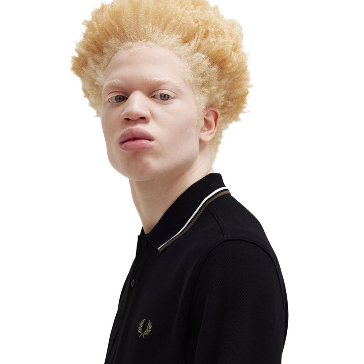 The Fred Perry Long Sleeve Twin Tipped Polo Shirt in Black/Ecru/Green offers a regular fit made from high-quality cotton piqué. It is characterized by its iconic twin-tipped collar, long sleeves, a two-button placket, and ribbed cuffs for a refined and classic look.