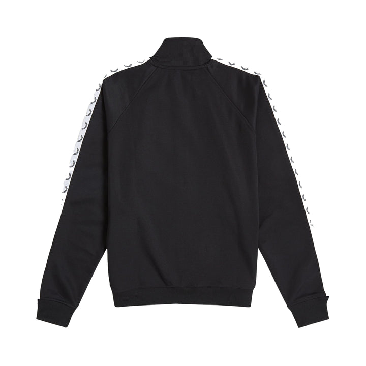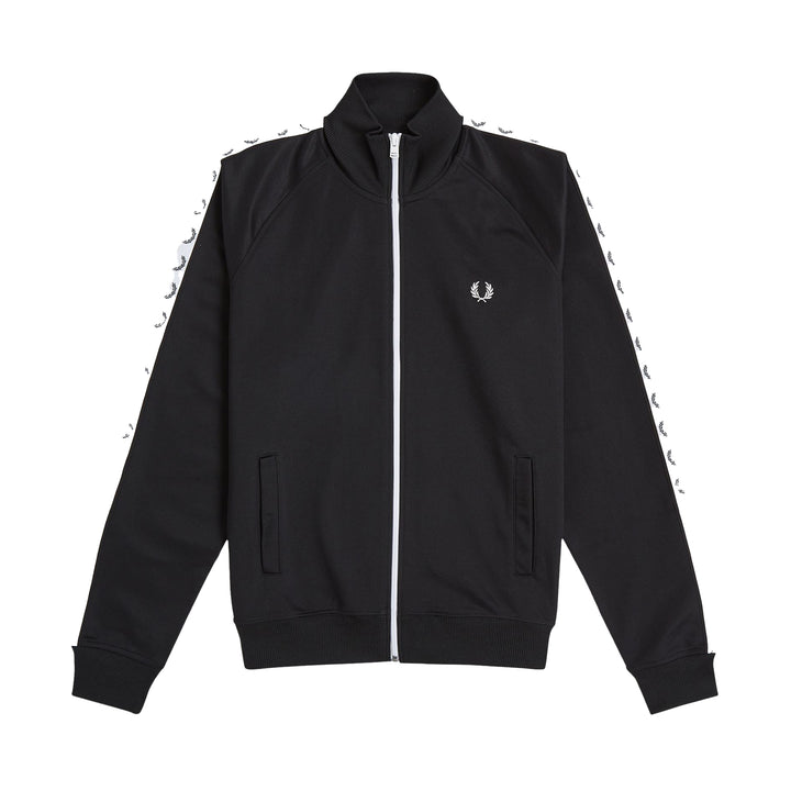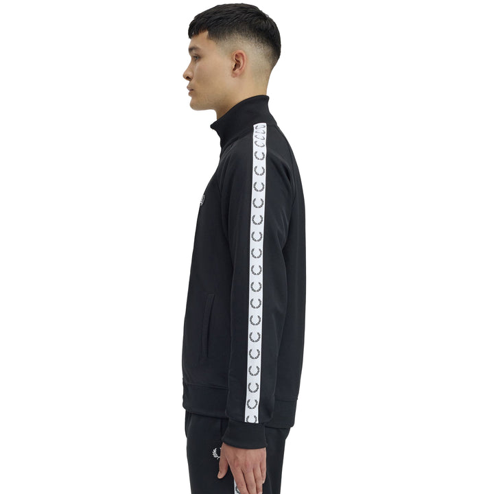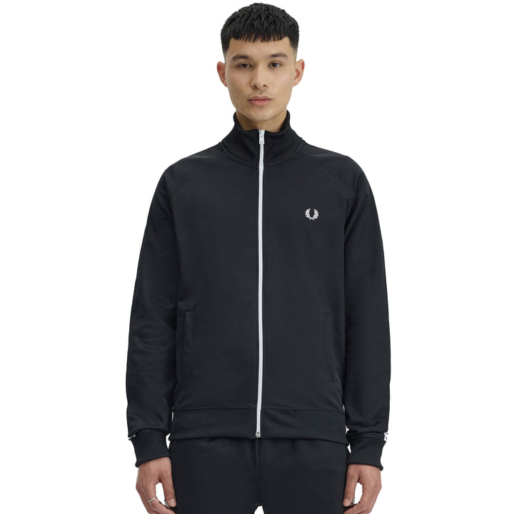 This Fred Perry track top delivers understated quality in black. Built with a regular fit, funnel neck, and full zip closure, it features the brand's signature taped sleeves and contrasting white zip with branded puller. Practical side pockets and the embroidered Laurel Wreath logo on the chest complete the design. A straightforward choice for those who appreciate authentic sportswear heritage.
