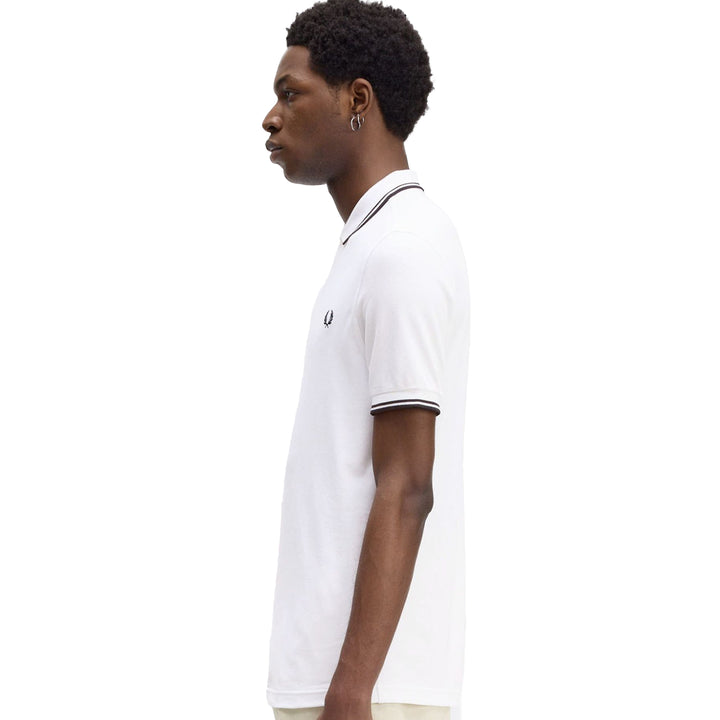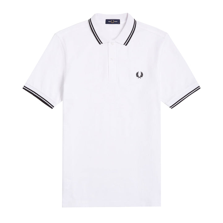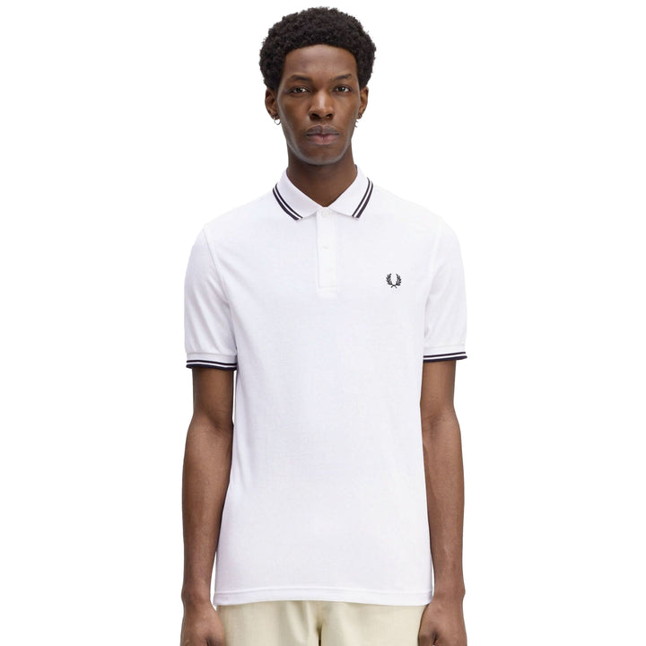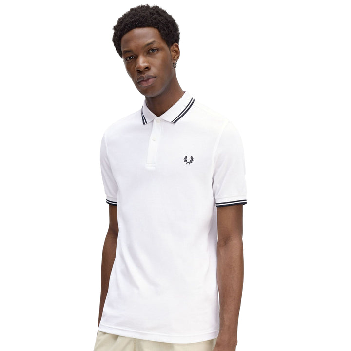 The Fred Perry Twin Tipped Polo Shirt in White features a regular fit design crafted from premium cotton piqué. Distinguished by its signature twin-tipped collar and cuffs, this classic piece includes a practical two-button placket. The iconic Laurel Wreath embroidery completes this quintessential Fred Perry garment.