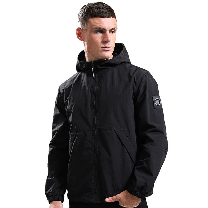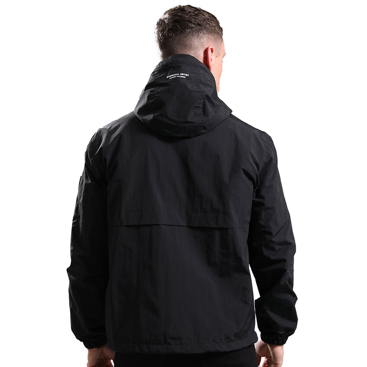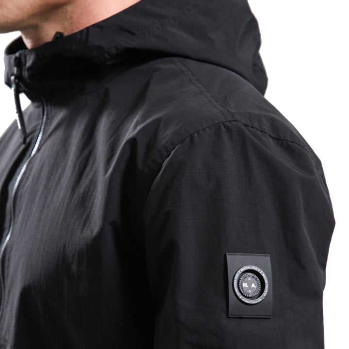 The Marshall Artist Alpha Jacket in Black offers a regular fit and is crafted from water-resistant polyamide with a durable ripstop texture. It includes elasticated cuffs, a breathable mesh lining, and adjustable features on both the hood and hem. The design is completed with a Siren badge embellishing the left sleeve.