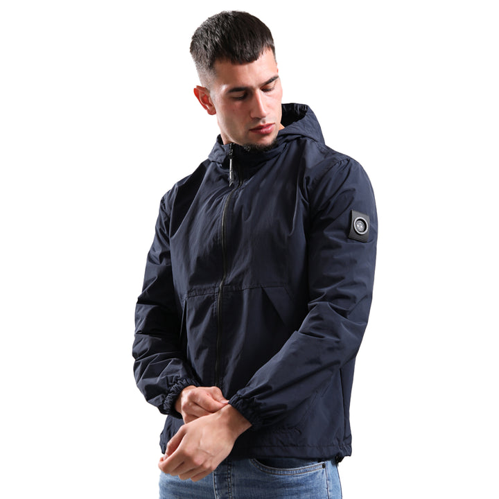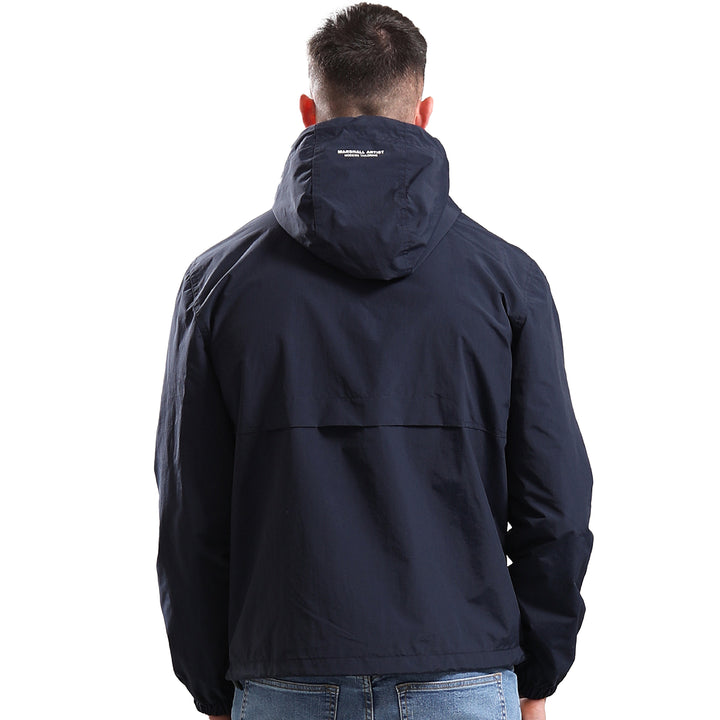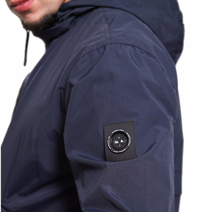 The Marshall Artist Alpha Jacket in Navy offers a regular fit and is crafted from water-resistant polyamide with a durable ripstop texture. It includes elasticated cuffs, a breathable mesh lining, and adjustable features on both the hood and hem. The design is completed with a Siren badge embellishing the left sleeve.