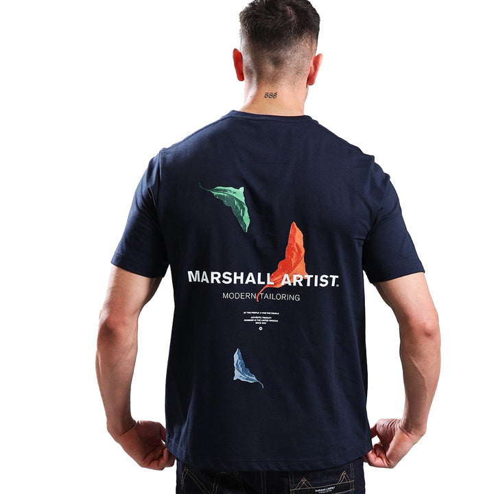 The Marshall Artist Aspen T-Shirt in Navy commands attention with its bold regular fit, sharp crew neck, and short sleeves. Striking graphic prints dominate both front and back, complete with unmistakable Marshall Artist branding.