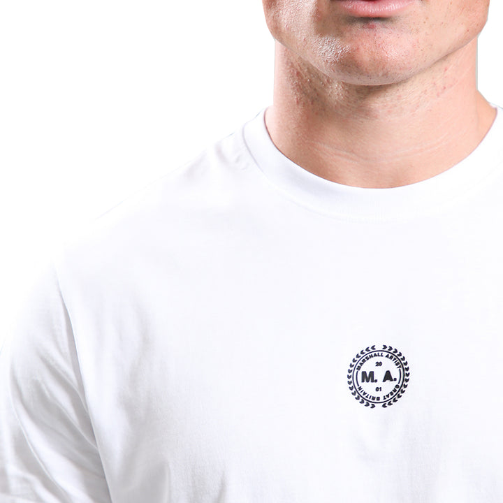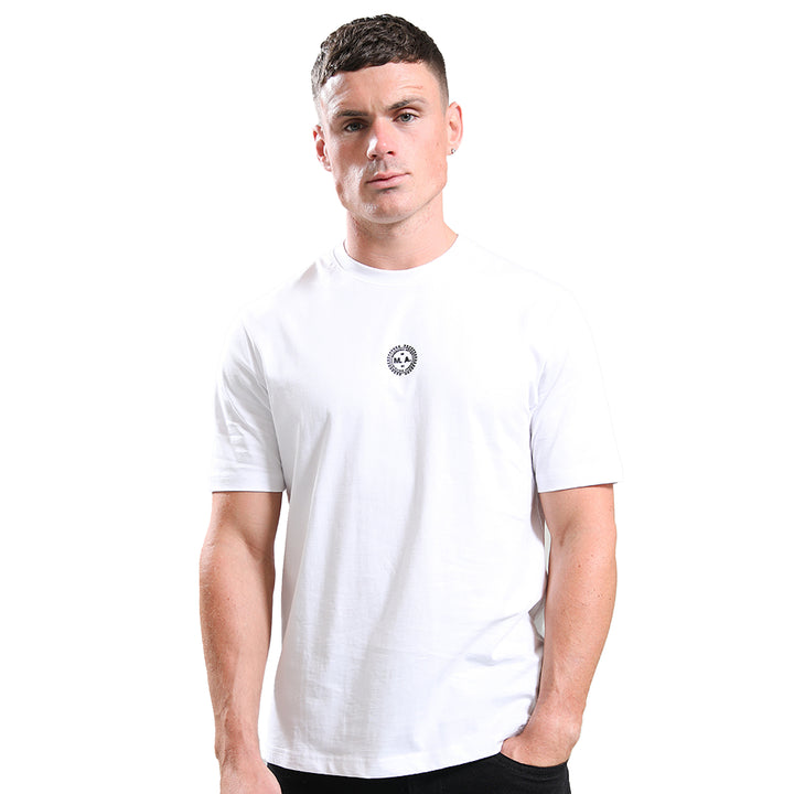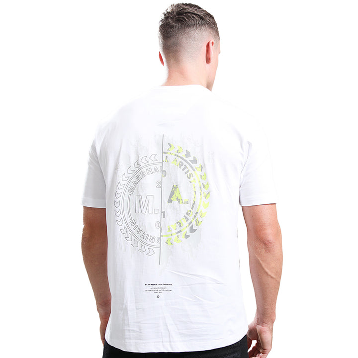 The Marshall Artist Photek Back Print T-Shirt in white features a regular fit with a sharp crew neck and short sleeves. It boasts a subtle rubberised logo on the chest and a bold, striking graphic stretching across the back for an edgy urban look.