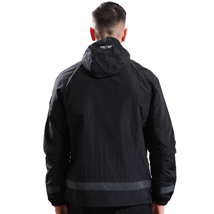 The Marshall Artist Photek Jacket Black offers a regular fit and is crafted from a lightweight, semi-translucent nylon ripstop fabric. It includes a contrasting krinkle nylon hood, internal collar, and detailed sleeve paneling. The jacket is equipped with two large chest pockets secured by velcro bellow closures, two side-entry pockets with snap fastenings, and concealed welt pockets. Elasticated cuffs and an adjustable bungee hem provide a customised fit. Finished with tonal black reflective MA branding and tape that extends from the back hem to the side pockets, plus a Siren badge on the left sleeve.