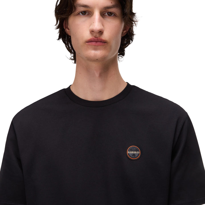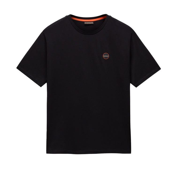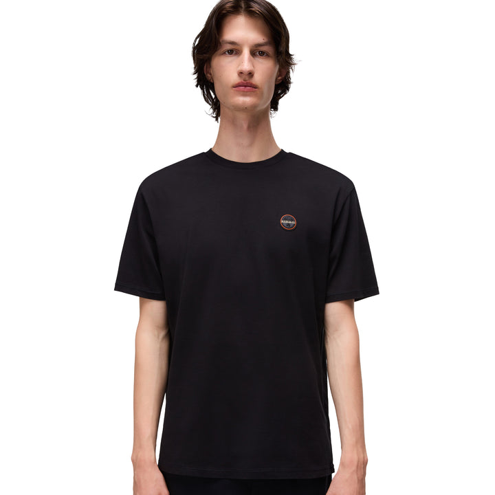 Presenting the luxurious Napapijri S Badge T-Shirt Black, featuring a classic regular fit, a refined crew neck, and elegant short sleeves adorned with a tasteful logo badge.