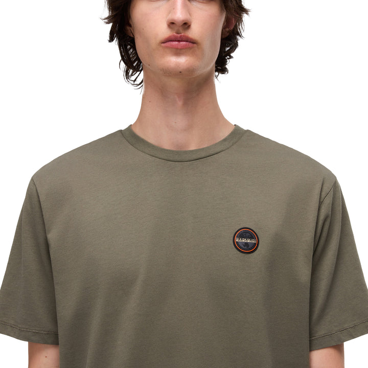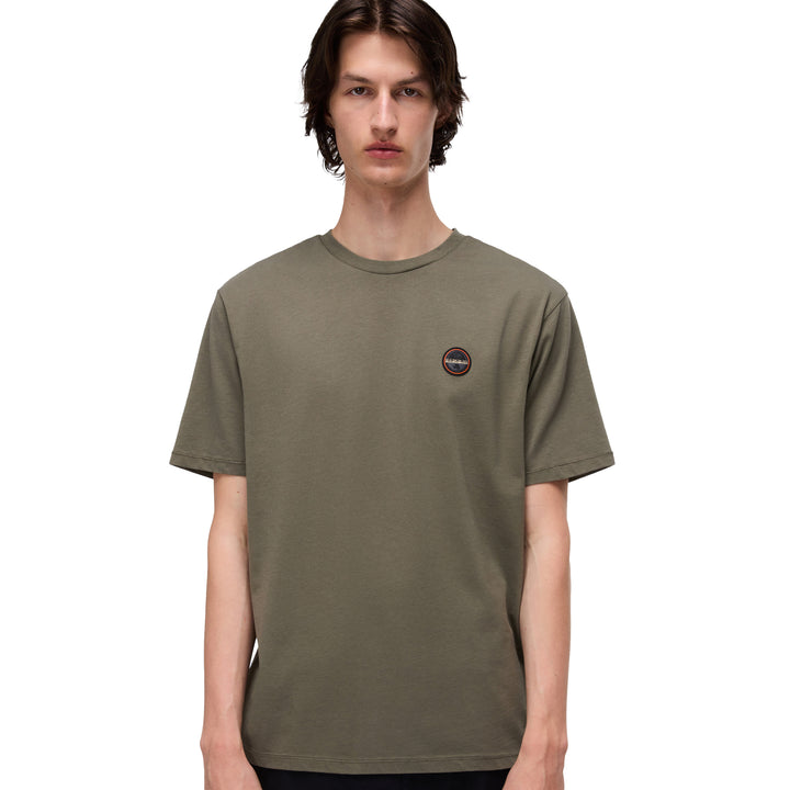 Presenting the luxurious Napapijri S Badge T-Shirt Tea Leaf, featuring a classic regular fit, a refined crew neck, and elegant short sleeves adorned with a tasteful logo badge.