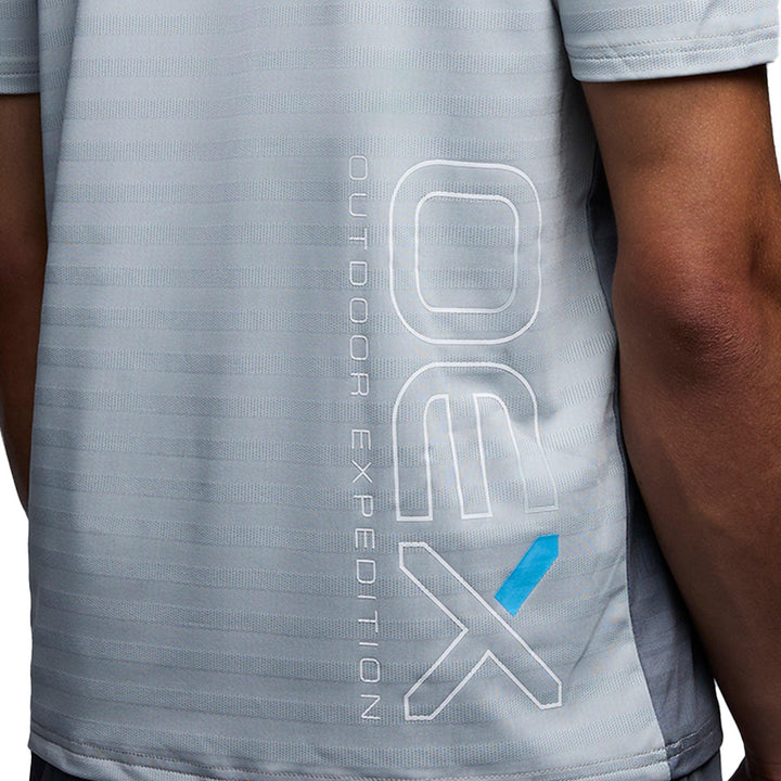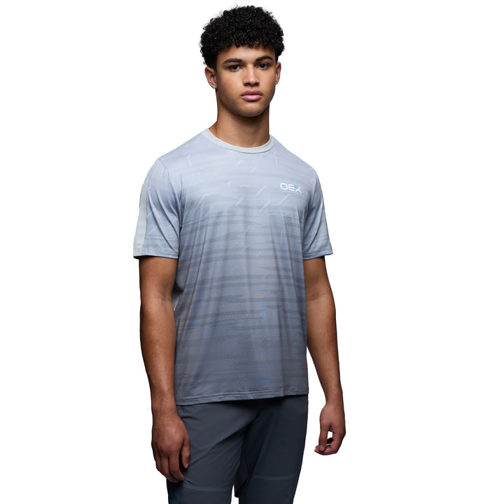 The OEX Helmer T-Shirt in Grey offers a regular fit and is made from breathable polyester to ensure comfort. This crew neck features twin stitch detailing and displays the OEX reflective print branding on both the front and back.