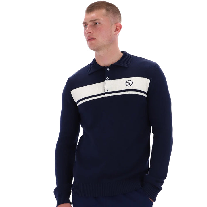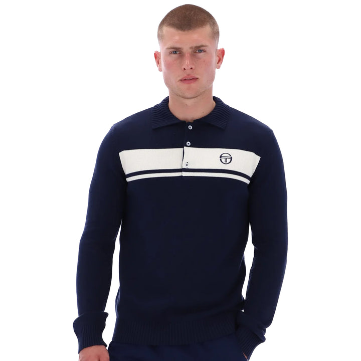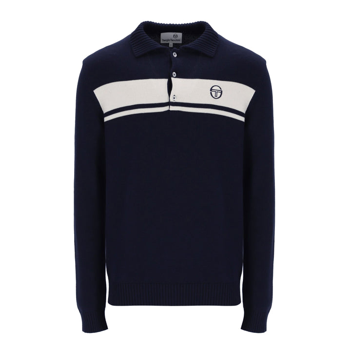 The Sergio Tacchini Damarindo Knitted Polo in Maritime Blue features a regular fit with a knitted fold-down collar. It includes a three-button placket and a contrasting knitted colour-block stripe across the chest. Finished with chunky ribbed cuffs and hem, it also displays the embroidered Sergio logo for an authentic touch.