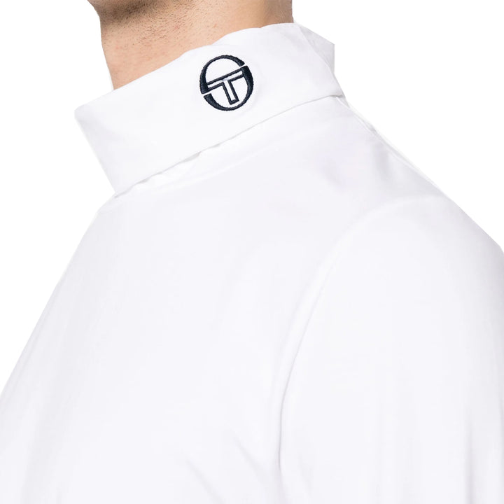 The Sergio Tacchini Edward Roll Neck T-Shirt in white offers a regular fit crafted from stretch cotton jersey. It features a roll neck and long sleeves, complemented by an embroidered Sergio Tacchini logo for a refined finish.