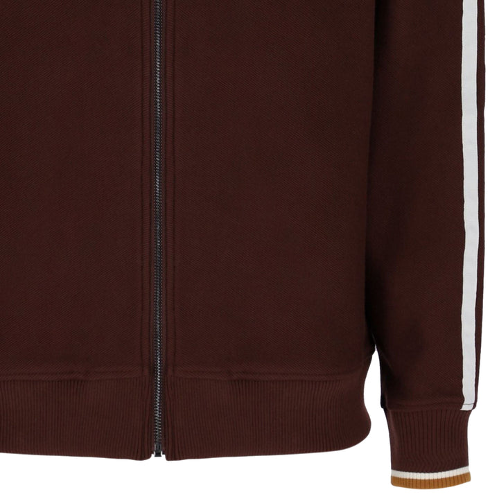 The Sergio Tacchini Giorno Track Top Jacket in Bitter Chocolate features a regular fit with a full zip front. It is detailed with contrast colour stripes along the collar and stripe taping on the sleeves, complemented by side pockets. The jacket showcases the Sergio Tacchini embroidered logo for a refined finish.
