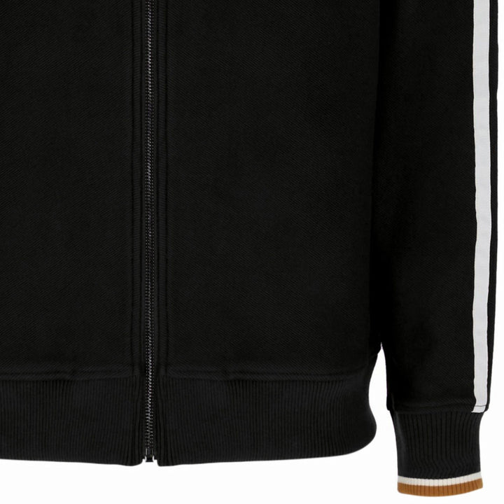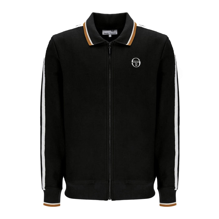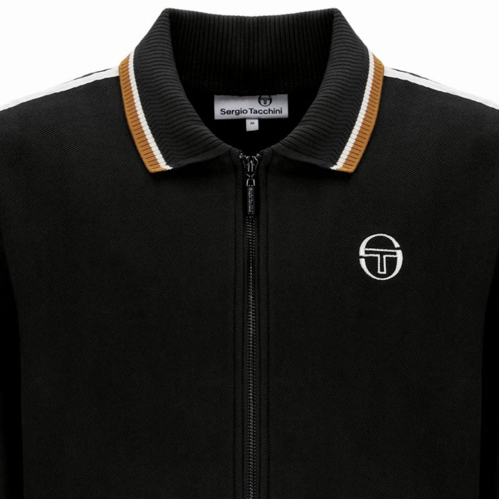 The Sergio Tacchini Giorno Track Top Jacket in Black features a regular fit with a full zip front. It is detailed with contrast colour stripes along the collar and stripe taping on the sleeves, complemented by side pockets. The jacket showcases the Sergio Tacchini embroidered logo for a refined finish.