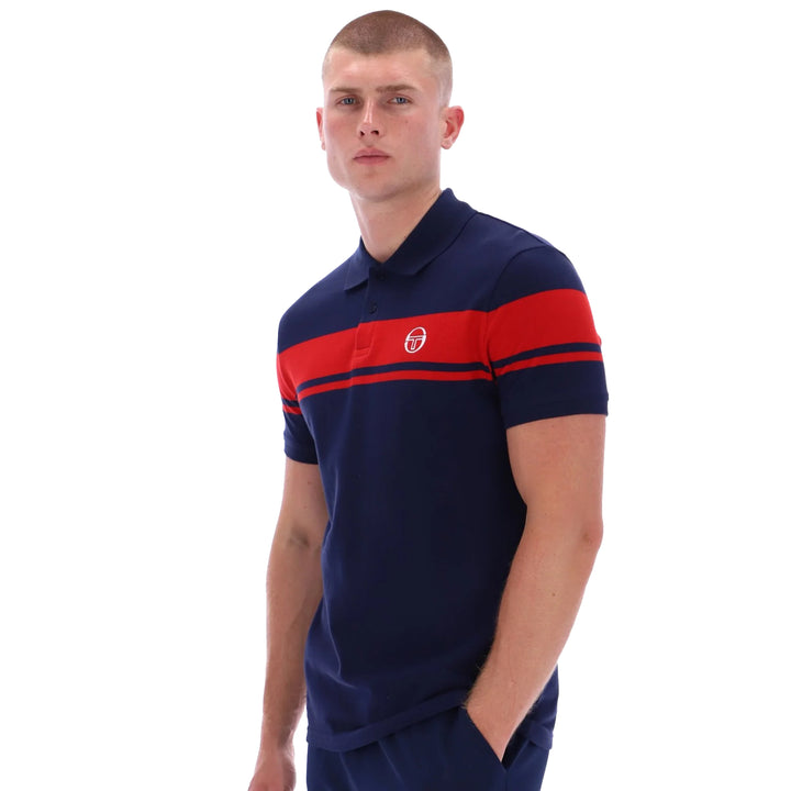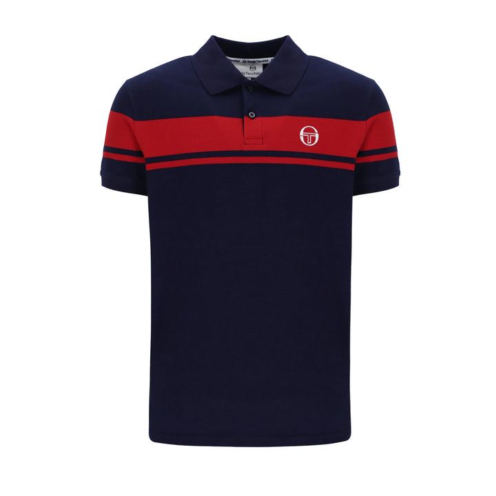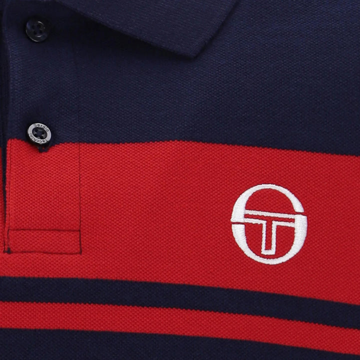 Sergio Tacchini's Young Line Polo Shirt in Maritime Blue/Adrenaline Rush boasts a regular fit, fold-down collar, and two-button placket fastening. It features contrasting colour stripe detail and short sleeves, all adorned with the signature Sergio Tacchini branding. Sophisticated and exclusive, this polo shirt exudes elegance and style.